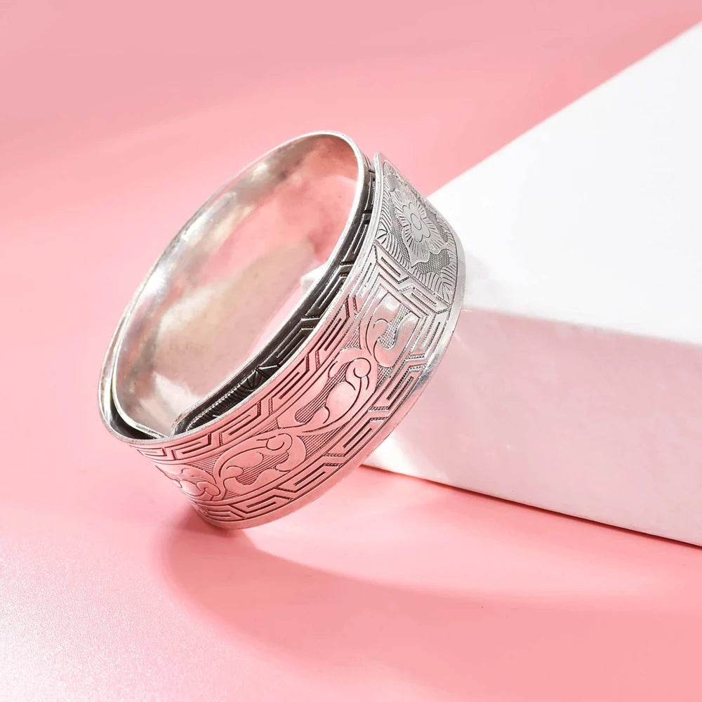 Feiern Sie zeitlose Schönheit mit dieser klassischen Manschette im Vintage-Stil, verziert mit zart geschnitzten Blumenmotiven, die an tibetische Kunst erinnern. Das silberne Finish und die ethnischen Details verleihen jedem Look einen anmutigen Boho-Charme, vom Festival-Chic bis zum minimalistischen Alltagsstil. Ein vielseitiges Statement-Stück, das sich besonders anfühlt und umwerfend aussieht.