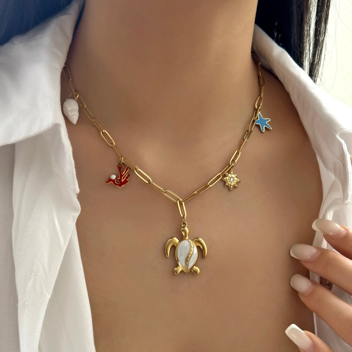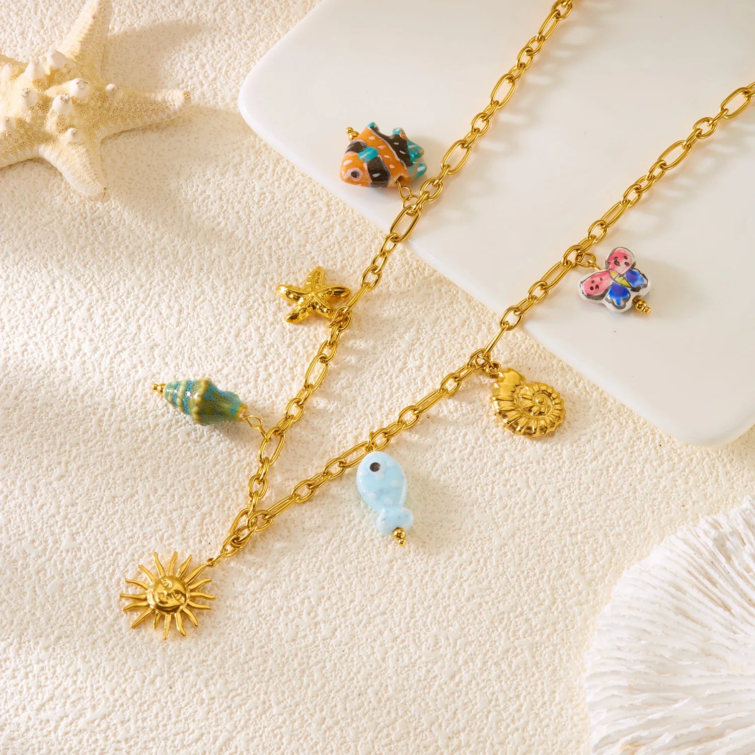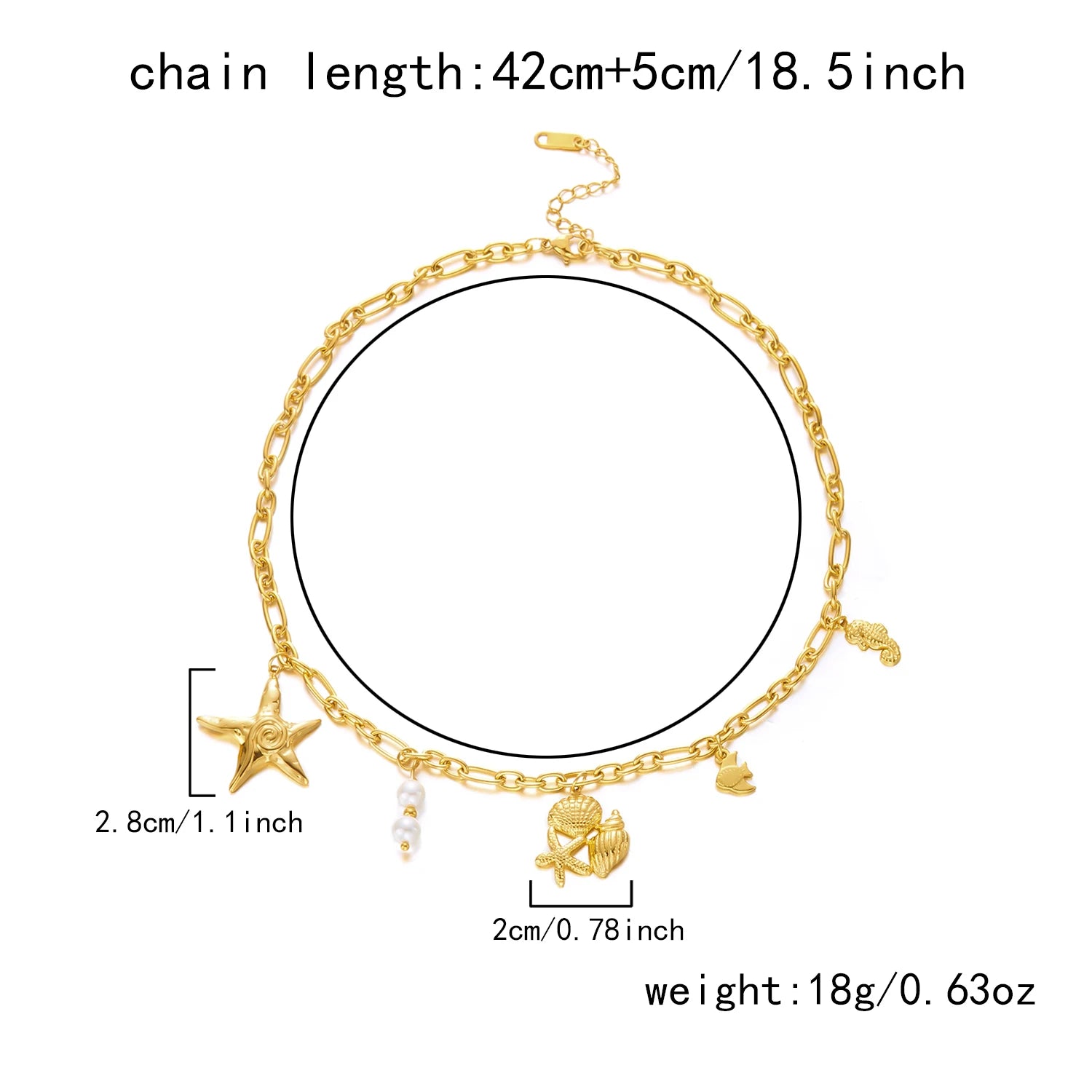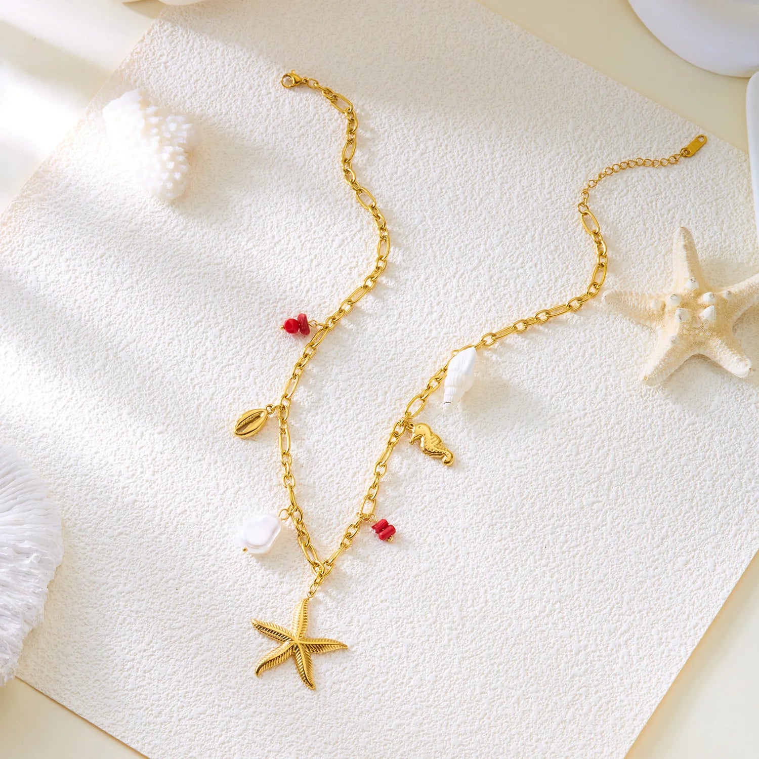 - Design: Showcases a starfish pendant along with other sea-inspired patterns like dolphins and turtles, reflecting a trendy animal style that's perfect for various looks.