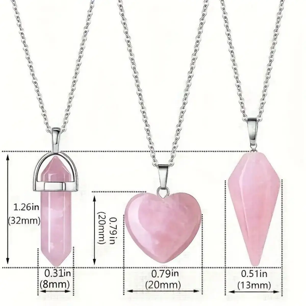 - Includes three distinct shapes: a heart-shaped pendant (20x20x6mm, about 20g), a hexagonal pyramid pendant (32x10mm, about 30g), and a hexagonal prism pendant (32x8mm, about 25g), all with a 24-inch (60cm) adjustable chain for comfortable wear.